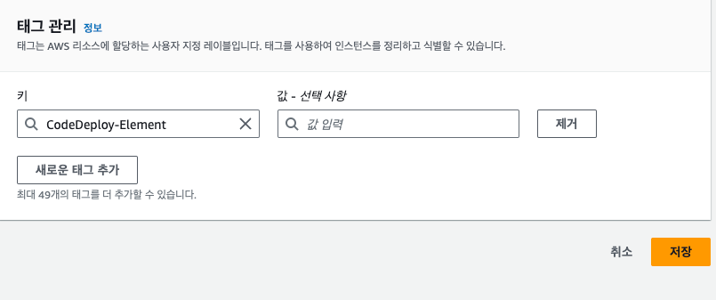 태그를 이용해 인스턴스를 식별하고 정리할 수 있다. 필요한 태그를 추가하고 저장한다.