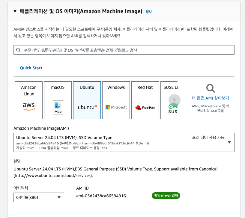 운영체제는 우분투(Ubuntu)를 사용할 것이며, 프리 티어(Free Tier) 기능을 선택하여 무료로 이용할 수 있다.