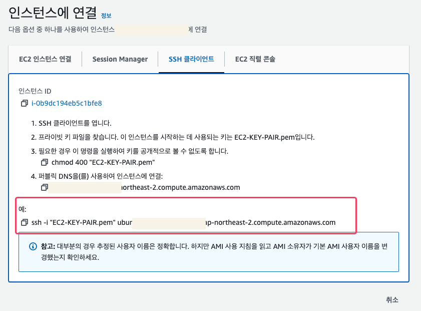 생성된 인스턴스에 직접 접근하여 필요한 설정을 진행한다. 아래 제공된 명령어를 사용하여 터미널에서 EC2 인스턴스에 접속한다.