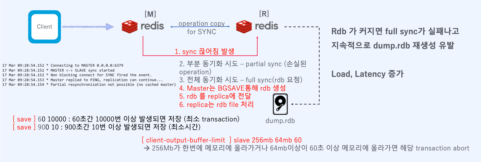 Full Sync가 실패하는 주된 원인 중 하나는 Replica의 client-output-buffer-limit 설정이 너무 낮아 대량의 데이터를 받을 수 없는 경우다. Redis는 네트워크 버퍼를 관리하기 위해 client-output-buffer-limit를 사용하여, 특정 버퍼 크기를 초과하는 클라이언트 연결을 종료시킬 수 있다. 이 값이 너무 낮으면, 특히 대용량 데이터를 동기화해야 하는 경우 Replica가 동기화 중에 연결이 끊어질 수 있다.