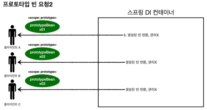 - 프로토타입 빈의 관리는 빈을 조회한 클라이언트가 해야 하며, 종료 메서드 호출도 클라이언트가 직접 해야 한다.