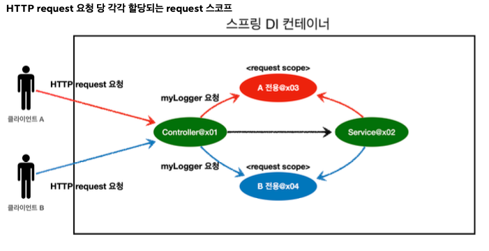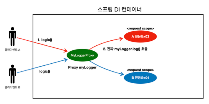 - 이렇게 설정하면 MyLogger의 가짜 프록시 클래스를 만들어두고 HTTP request와 상관없이 가짜 프록시 클래스를 다른 빈에 미리 주입해 둘 수 있다.