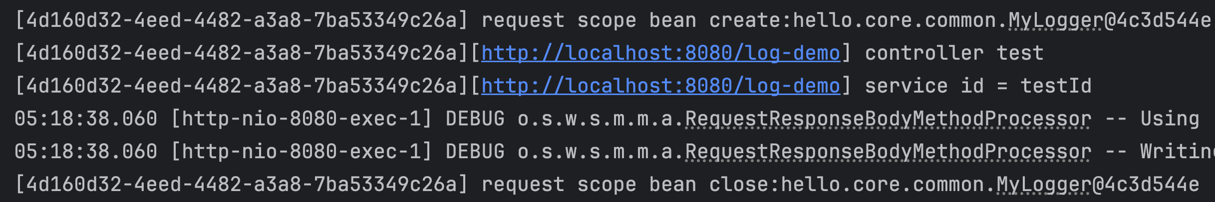 - 이 시점에도 같은 HTTP 요청이기 때문에 동일한 MyLogger 빈이 반환된다.