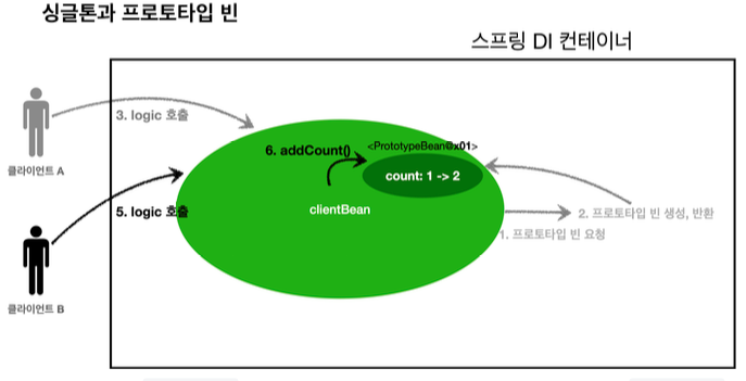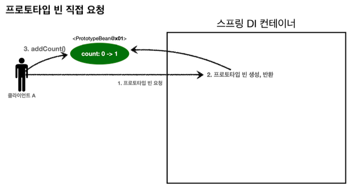 - 클라이언트는 조회한 프로토타입 빈에 addCount()를 호출하면서 count 필드를 +1 한다.