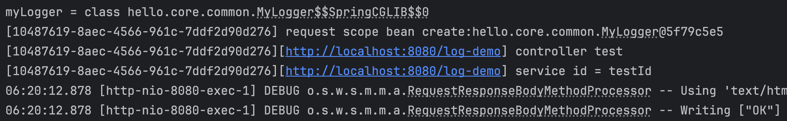 - MyLogger 빈은 requestURL을 설정하고 "controller test" 로그를 남긴다.