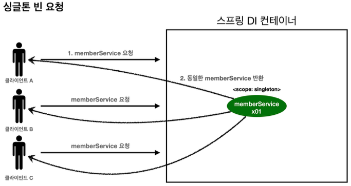 3. 이후에 스프링 컨테이너에 같은 요청이 와도 같은 객체 인스턴스의 스프링 빈을 반환한다.