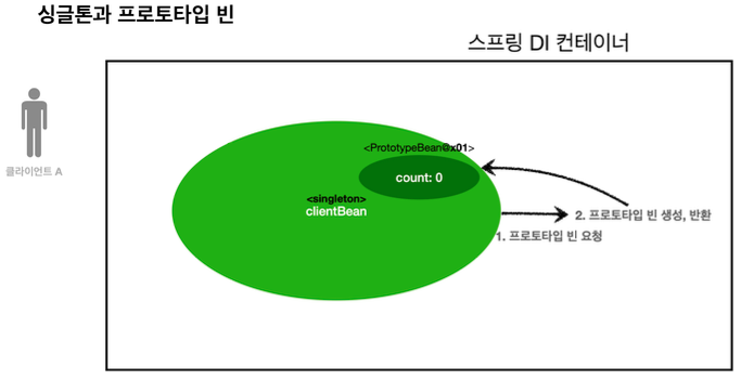 - 싱글톤 빈은 스프링 컨테이너가 관리하기 때문에, 스프링 컨테이너가 종료될 때 빈의 종료 메서드가 실행된다. 그러나 프로토타입 빈은 스프링 컨테이너가 생성, 의존관계 주입, 초기화까지만 관여하고 더는 관리하지 않는다. 따라서 프로토타입 빈은 스프링 컨테이너가 종료될 때 @PreDestroy 같은 종료 메서드가 실행되지 않는다.