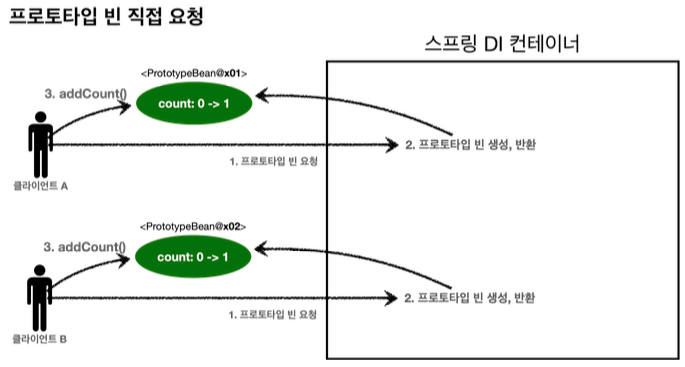 - 스프링 컨테이너에 요청할 때마다 새로 생성된다.