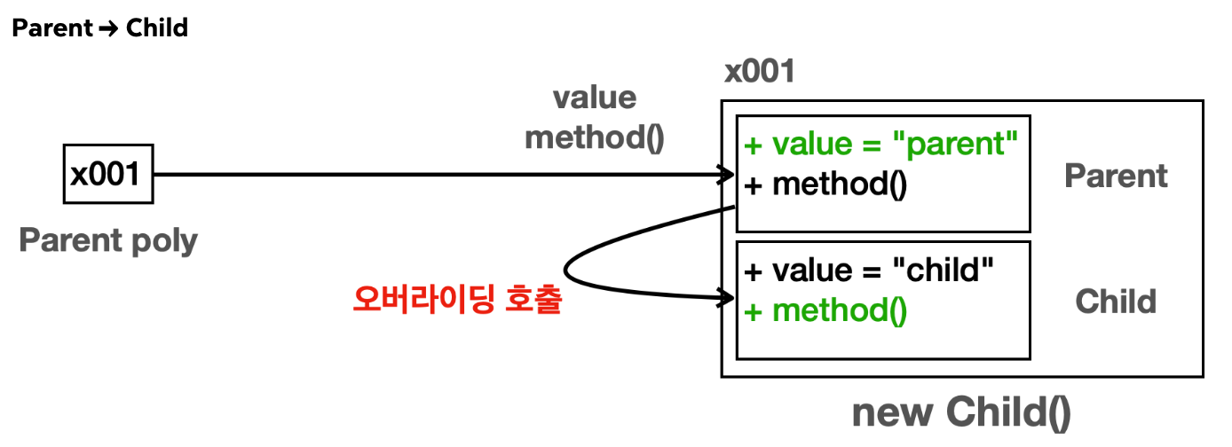 - poly.method() : 자식인 Child에서 method() 함수가 오버라이드 되어있으므로 Child.method()가 실행된다.