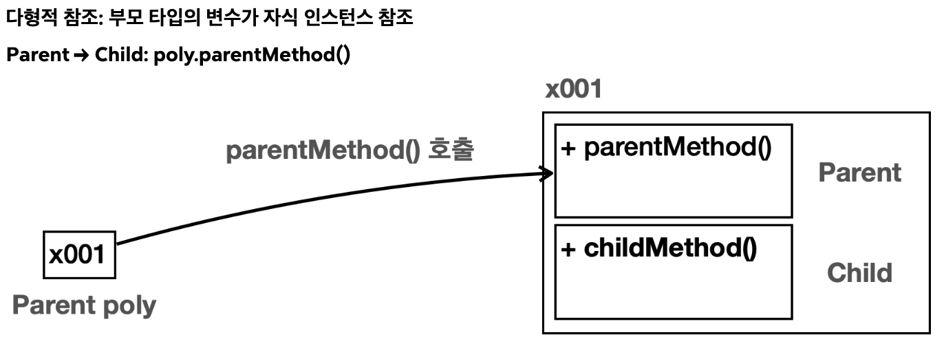 - 하지만 상속 관계는 부모로만 찾아서 올라갈 수 있다. 자식 타입에 있는 메서드는 호출할 수 없다.