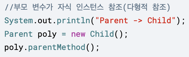 2. 캐스팅을 한다고 해서 Parent poly의 타입이 변하는 것은 아니다. 참조값을 꺼내고 꺼낸 참조값이 Child 타입이 되는 것이다.